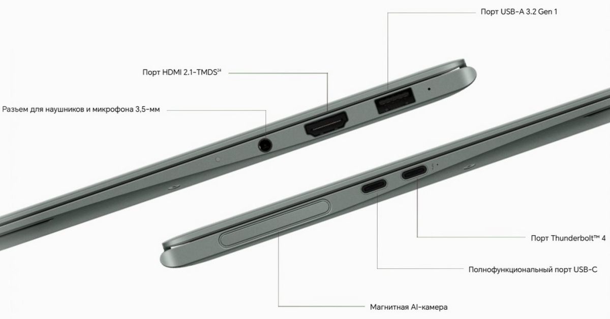 - Порты: Thunderbolt 4 х1, USB-C 3.2 Gen2 x1, USB-A 3.2 Gen1 x1, HDMI 2.1-TMDS x1, 3,5-мм разъём для гарнитуры и микрофона 2-в-1 x1