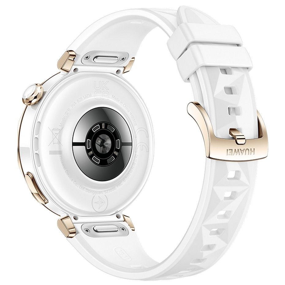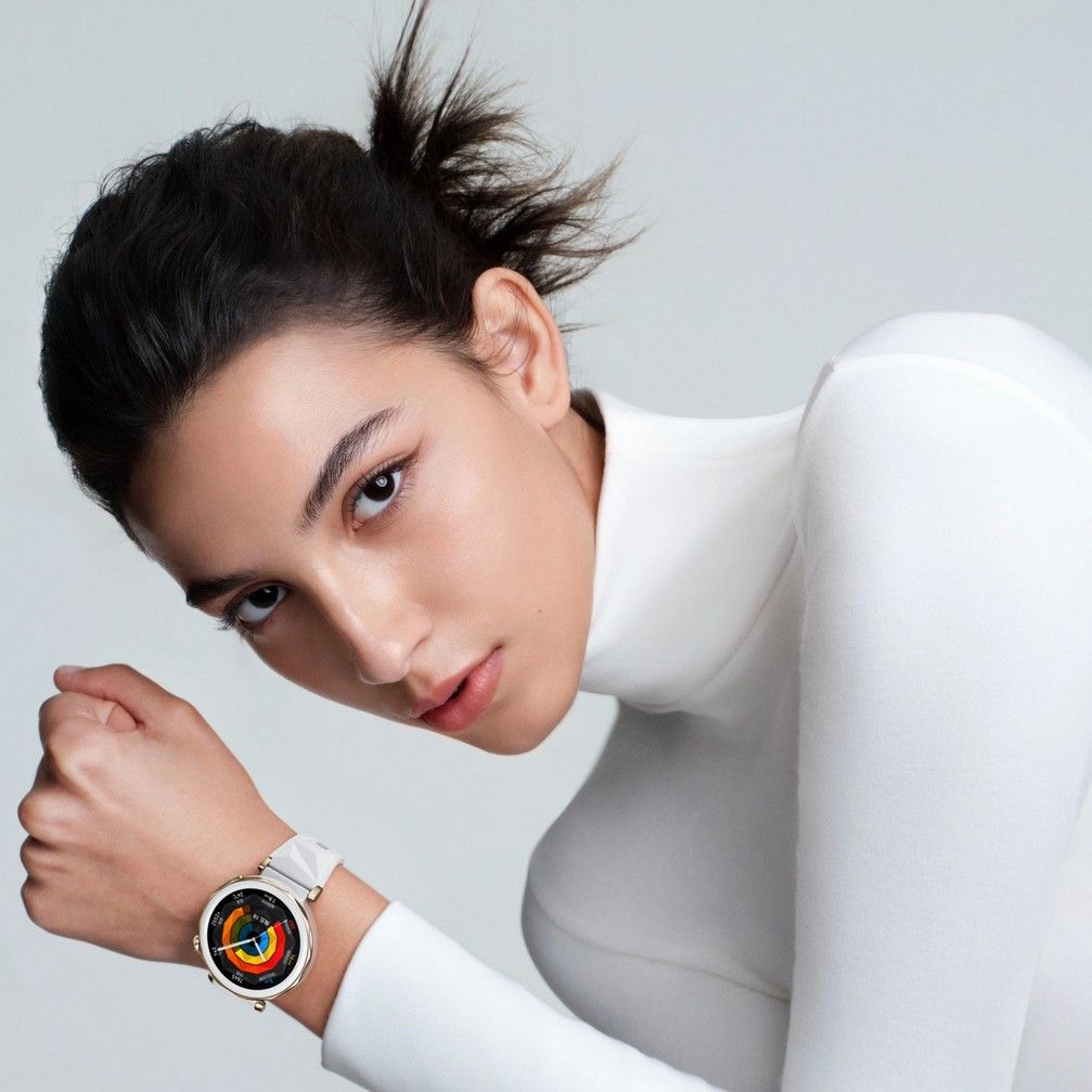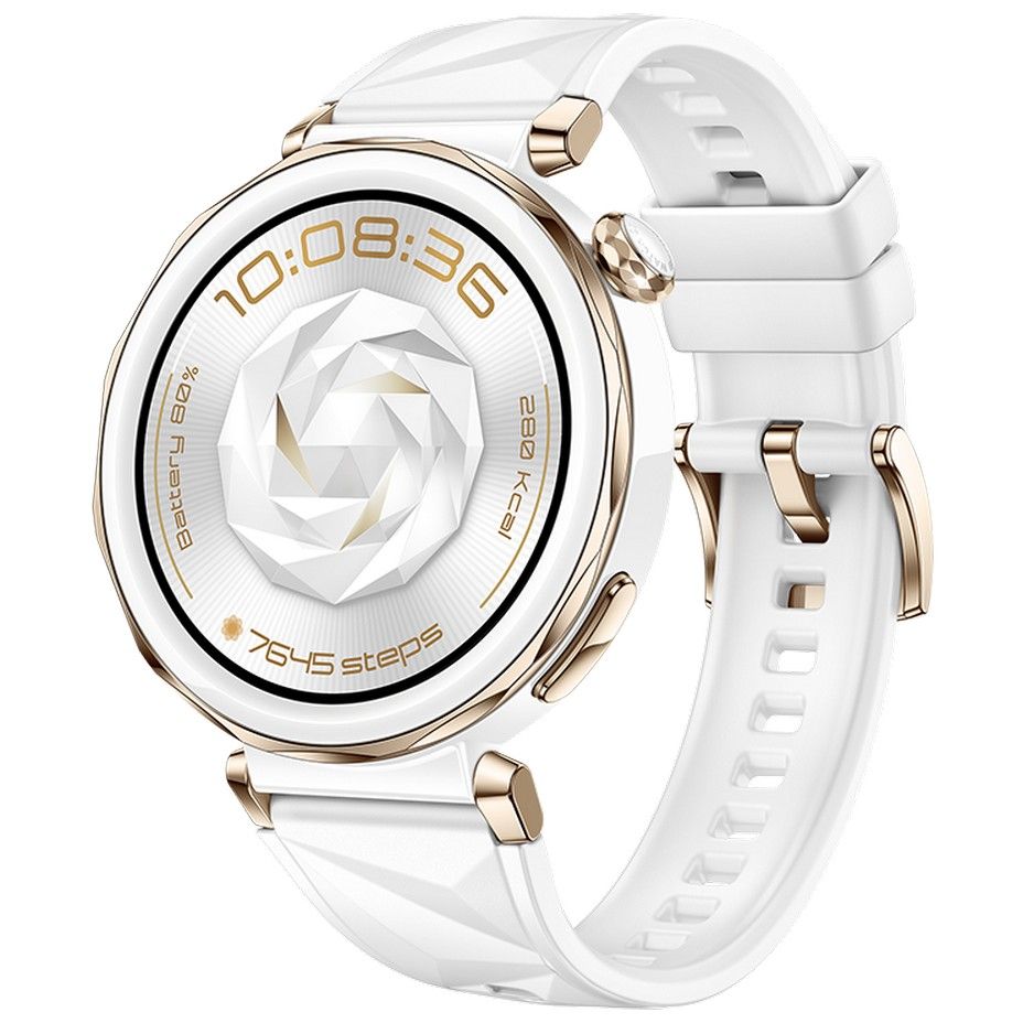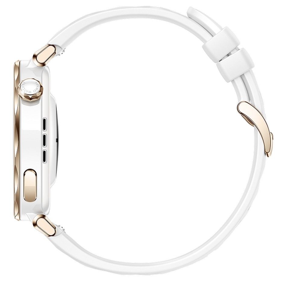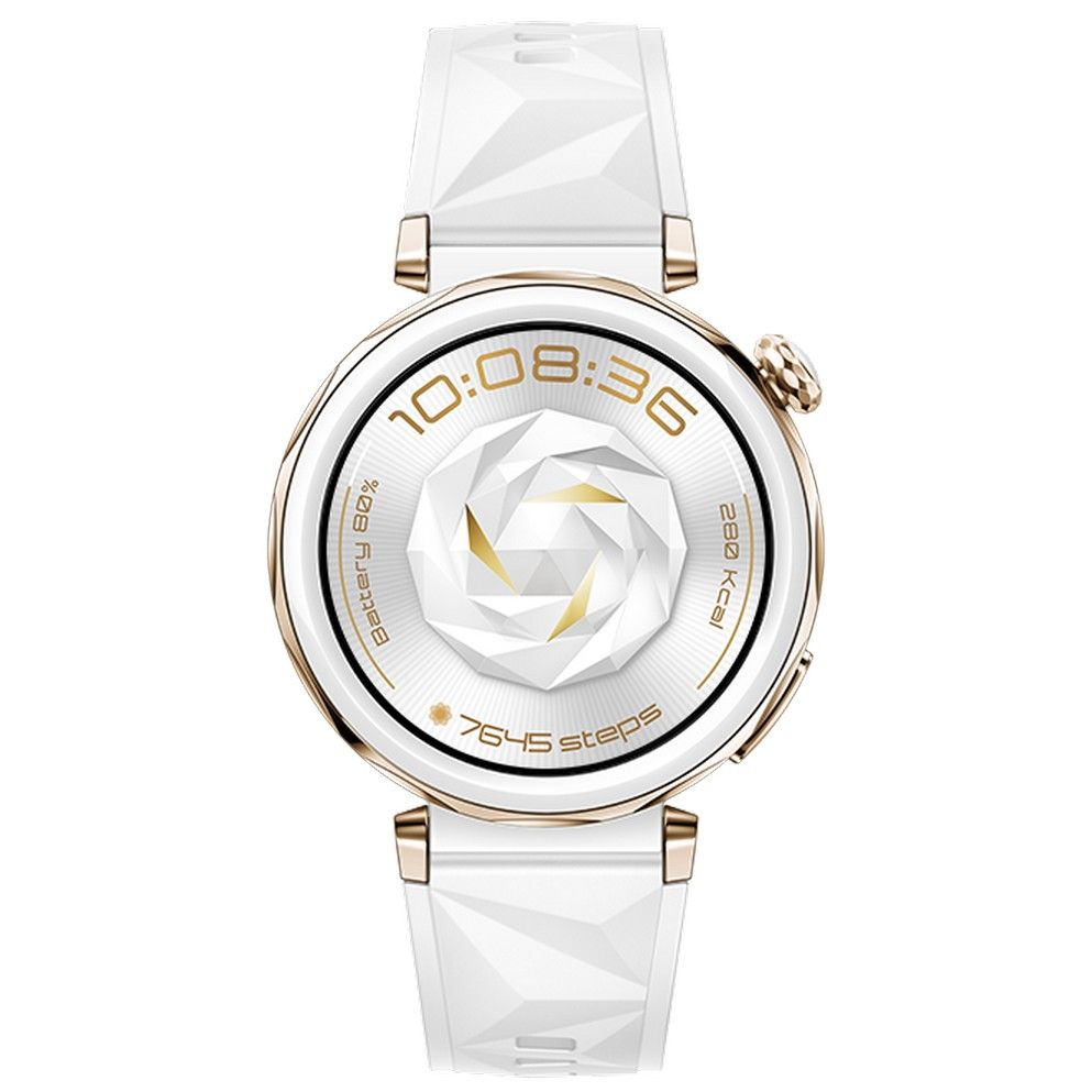 - Спортивная белая версия. Корпус из нанокристаллической керамики и текстурированный белоснежный фторэластомеровый ремешок сочетают в себе страсть и моду. Экран из сапфирового стекла подчеркивает премиальность дизайна, искрясь и сверкая. Безель и поворотная кнопка имеют красивые золотистые акценты, придающие часам вид дорогого украшения.