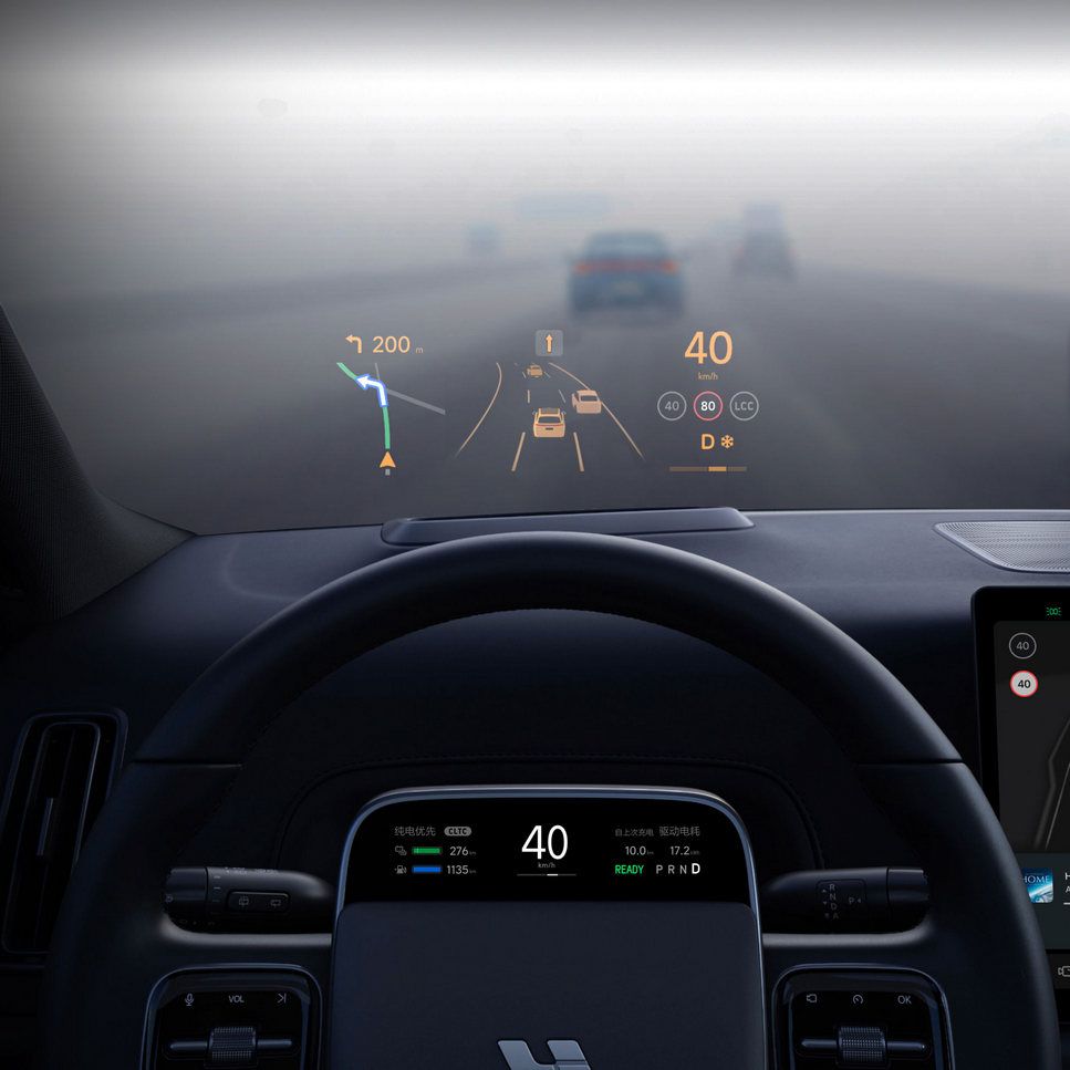 В режиме снега информация HUD отображается оранжевым цветом. Четко отображаются скорость, ограничение скорости, навигация, дорожные условия и т. д. Адаптивные возможности HUD позволяют автоматически регулировать высоту и яркость дисплея в зависимости от роста водителя, его позы и яркости окружающего освещения.