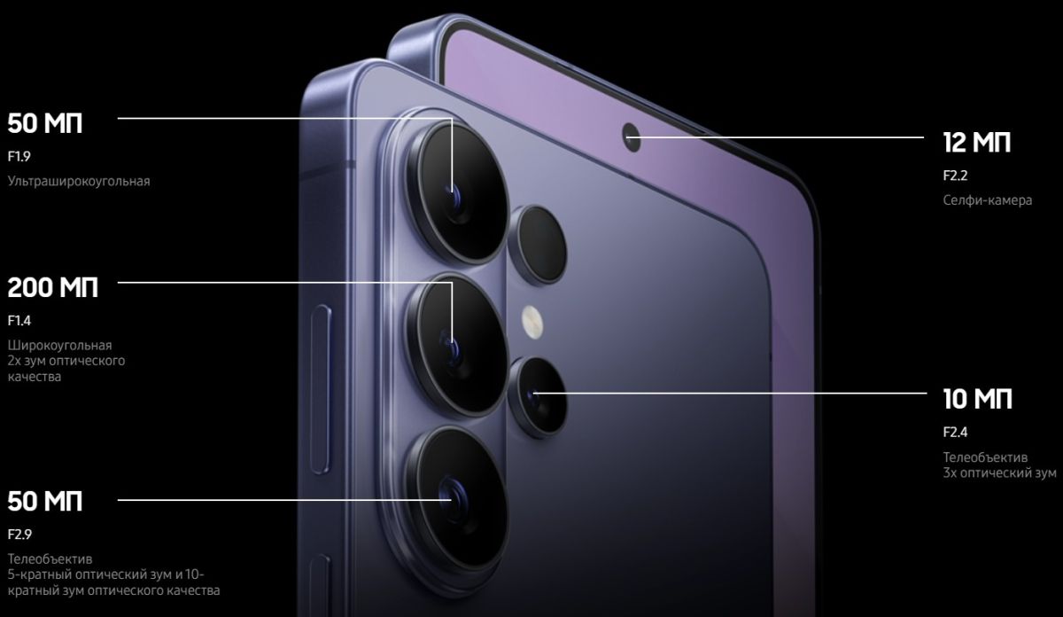 - 200 Мп, f/1.4, 2x оптический зум, OIS (Широкоугольная)