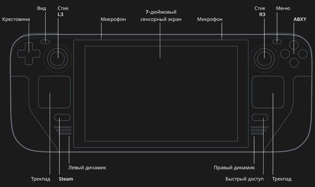 Steam Deck был разработан для длительных игровых сессий и имеет полноразмерное управление, которое всегда под рукой, пользуетесь вы стиками или трекпадами. Задняя сторона устройства задумана так, чтобы его было комфортно держать, вне зависимости от размера рук.