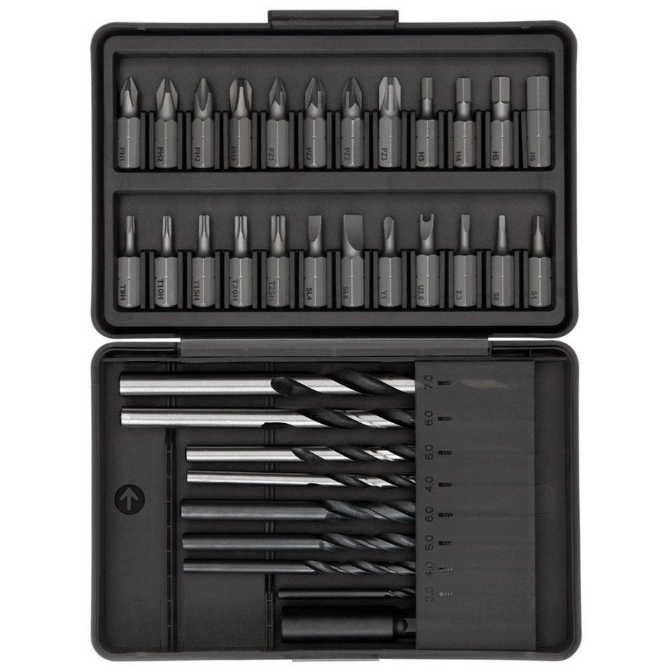 В комплекте с дрелью идут 24 бита и 8 сверл из стали марки S2 твердостью 60HRC. Они справляются с материалами различной плотности: деревом, сталью, бетоном и др. Дрель и биты хранятся в водонепроницаемой сумке для переноски.