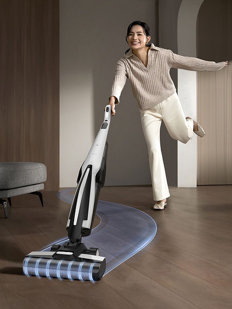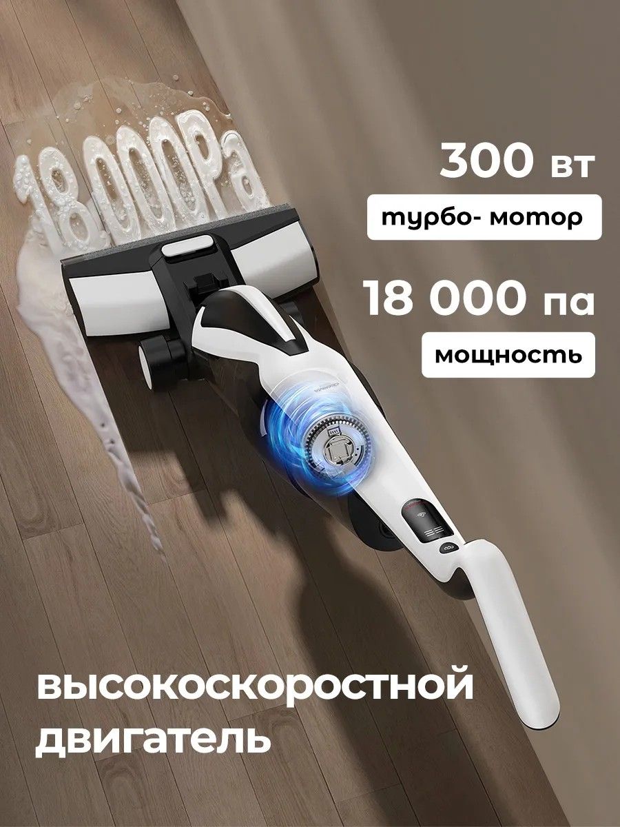 Высокопроизводительная вращающаяся щётка совершает до 2500 движений в минуту, обеспечивая интенсивное механическое воздействие на загрязнения. В сочетании с мощным двигателем силой всасывания 180 Вт устройство эффективно удаляет пыль, крошки, шерсть и сложные пятна с любых типов покрытий — от ламината и плитки до ковров с низким ворсом.