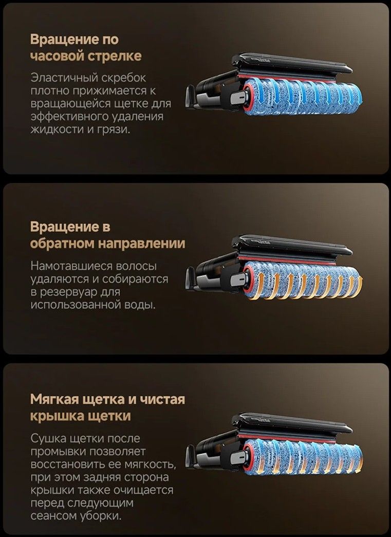 Полноразмерная щетка для уборки с обеих сторон плотно прилегает к поверхности в труднодоступных местах, обеспечивая тщательную очистку и исключая необходимость уборки остаточных загрязнений вручную на пропущенных участках.