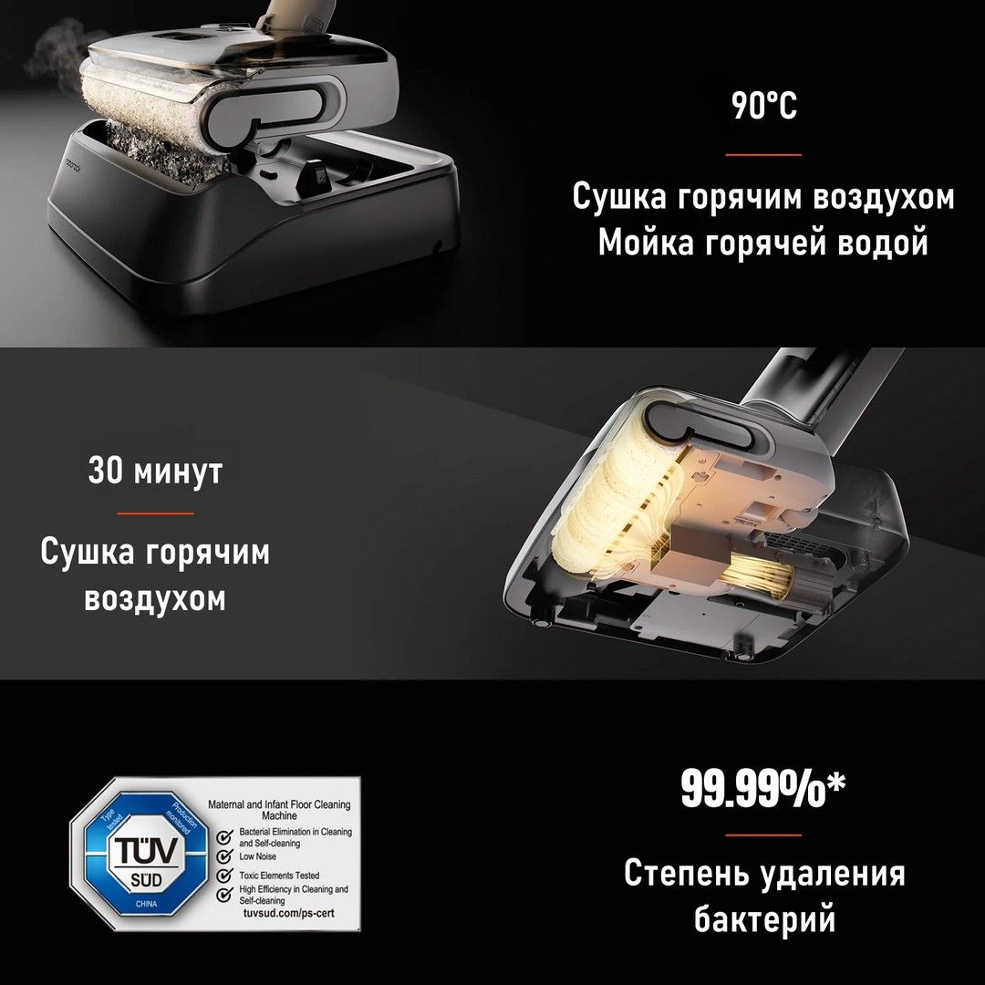 Откройте для себя непревзойдённую чистоту благодаря интеллектуальной системе самоочистки горячей водой и автоматической сушке. Он эффективно справляется как с влажными, так и с сухими загрязнениями, обеспечивает уборку вплотную к краям и легко проникает под мебель с низким основанием. Улучшенный дизайн с низким резервуаром для воды и поворотом на 70° позволяет легко обходить мебель и препятствия.