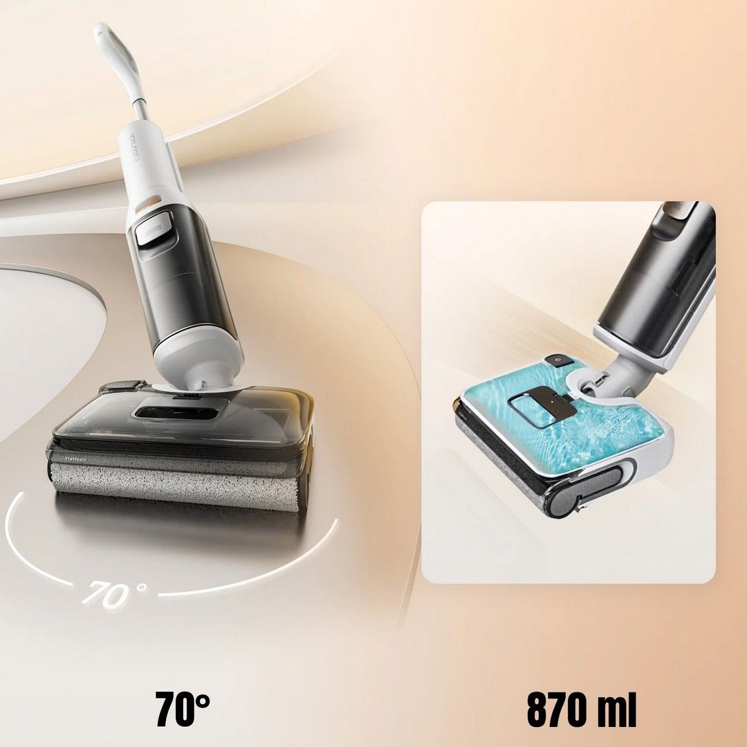 Благодаря резервуару для воды 870 мл с низким уровнем заполнения и поворотному механизму на 70° вы сможете легко обходить мебель и препятствия, обеспечивая более качественную и эффективную уборку.