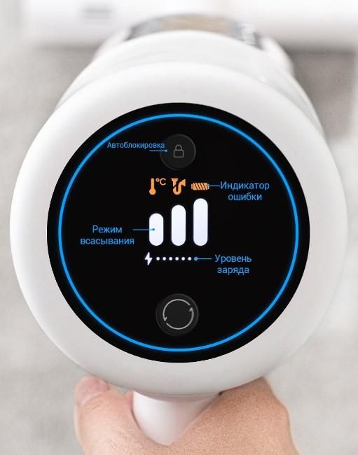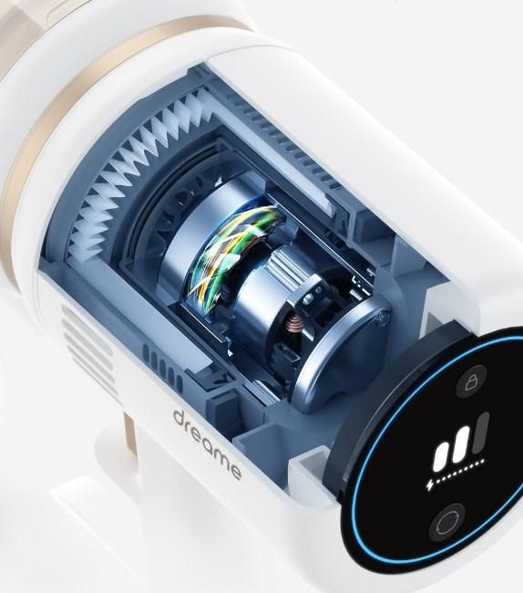 Производитель оснастил аппарат бесщеточным двигателем с продолжительным ресурсом работы. Он обеспечивает вращение до 100 тысяч оборотов в минуту, за счет чего мощность всасывания достигает 100 Вт. Режимы всасывания переключаются на сенсорном дисплее.