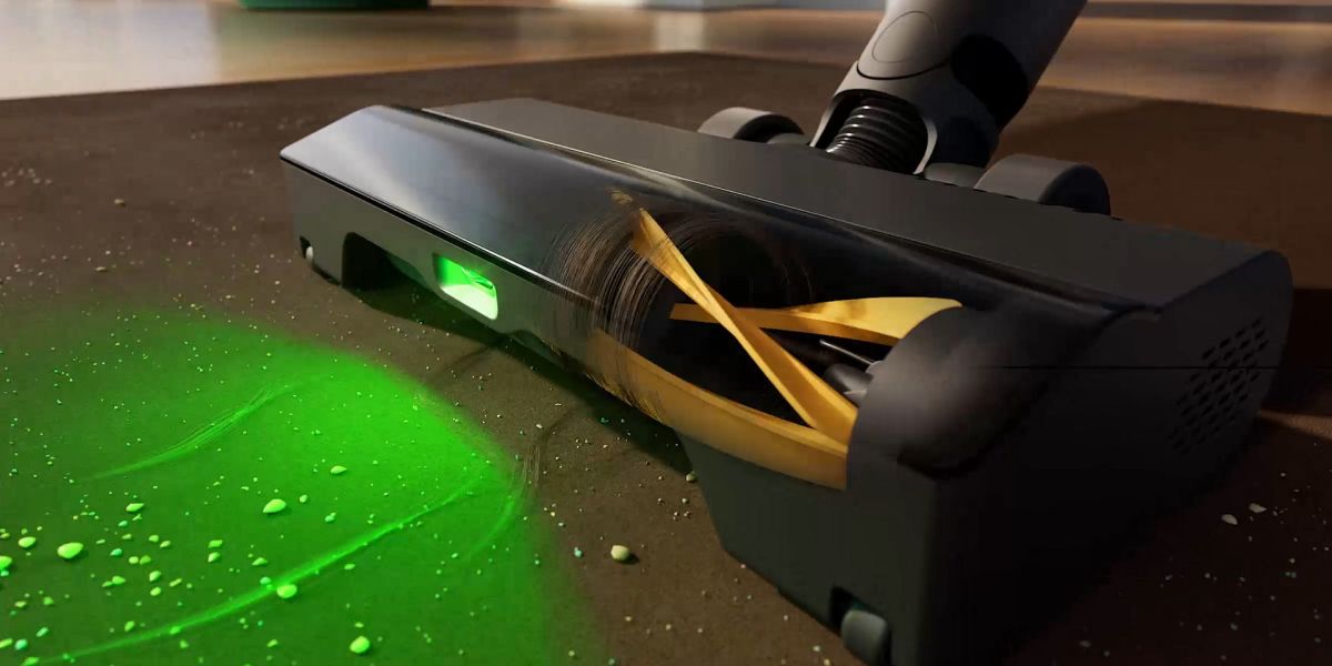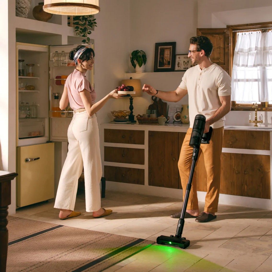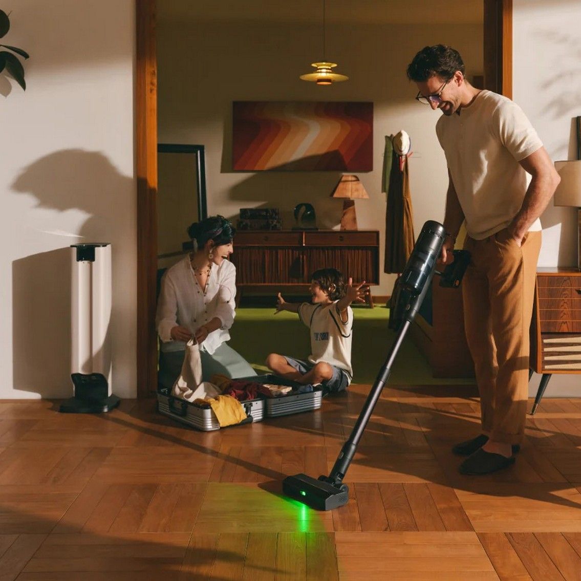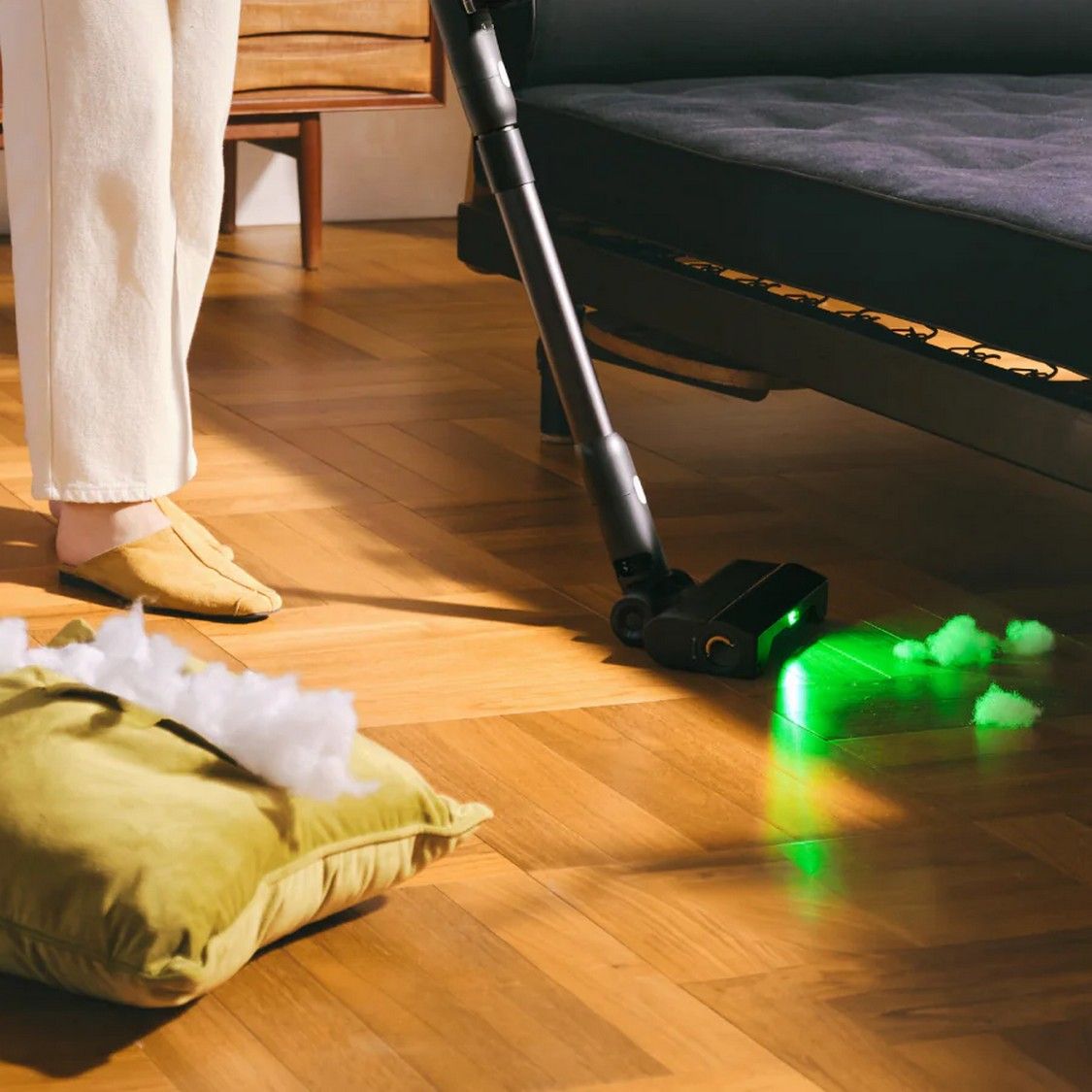 Мощный зелёный луч делает невидимую пыль и мелкие частицы заметными, обеспечивая более тщательную уборку. Центральное расположение под углом 140° охватывает максимальную площадь пола для глубокого очищения.