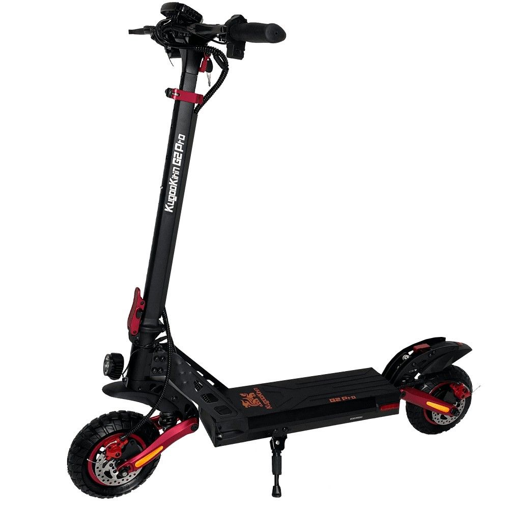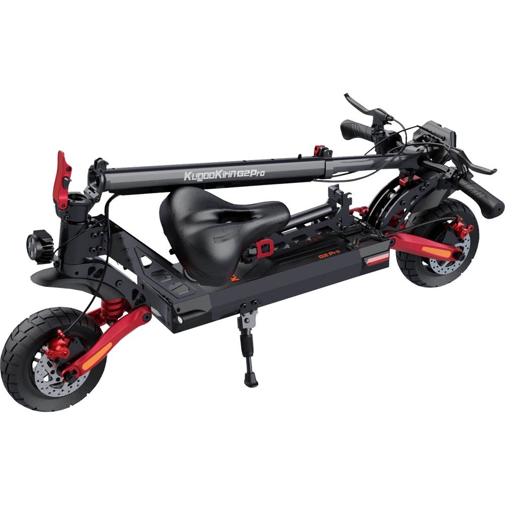 Kugoo Kirin G2 Pro в отличае от большинства моделей среднего класса электросамокат имеет передние и задние дисковые тормоза, благодаря которым достигается максимально плавное торможение. У модели полностью снимается сиденье, складывается рулевая стойка и ручки. В сложенном состоянии его размеры 120 на 50 см, устройство можно перемещать в багажнике автомобиля, а также взять с собой в общественный транспорт.