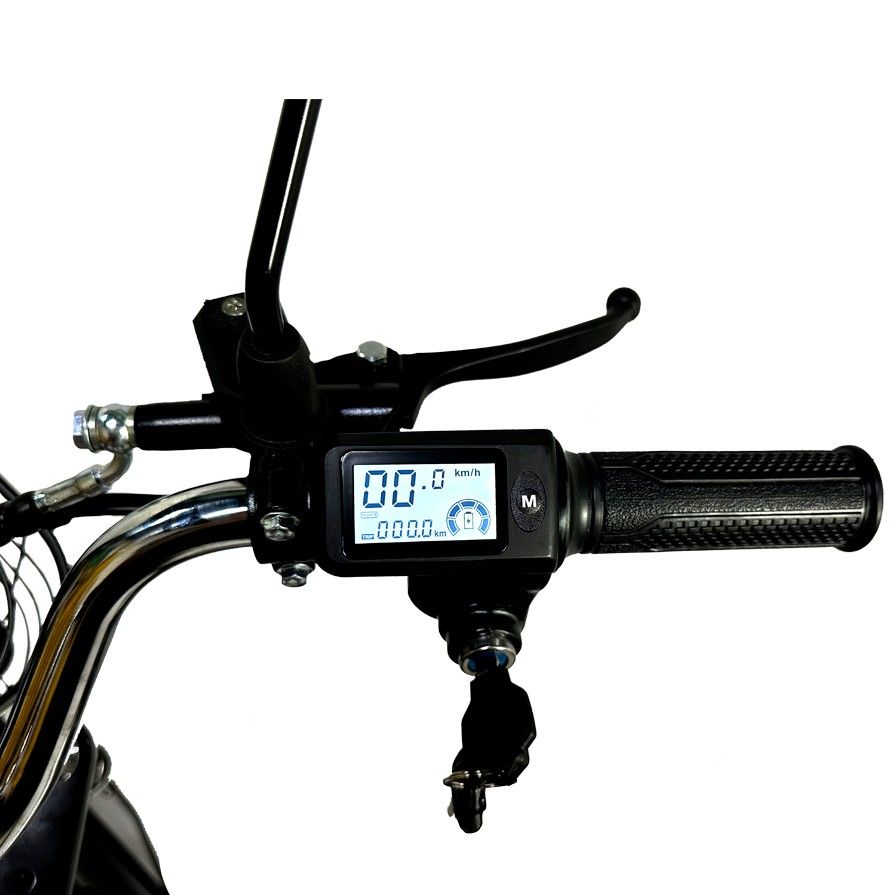 Электровелосипед Kugoo V3 Pro удобен в управлении – все основные функции расположены на руле под большими пальцами: звуковой сигнал, включение освещения и поворотников, переключения скорости и привода. На большом цветном дисплее отображается скорость, пробег, заряд аккумулятора, также индикаторы включенного освещения и поворотников.