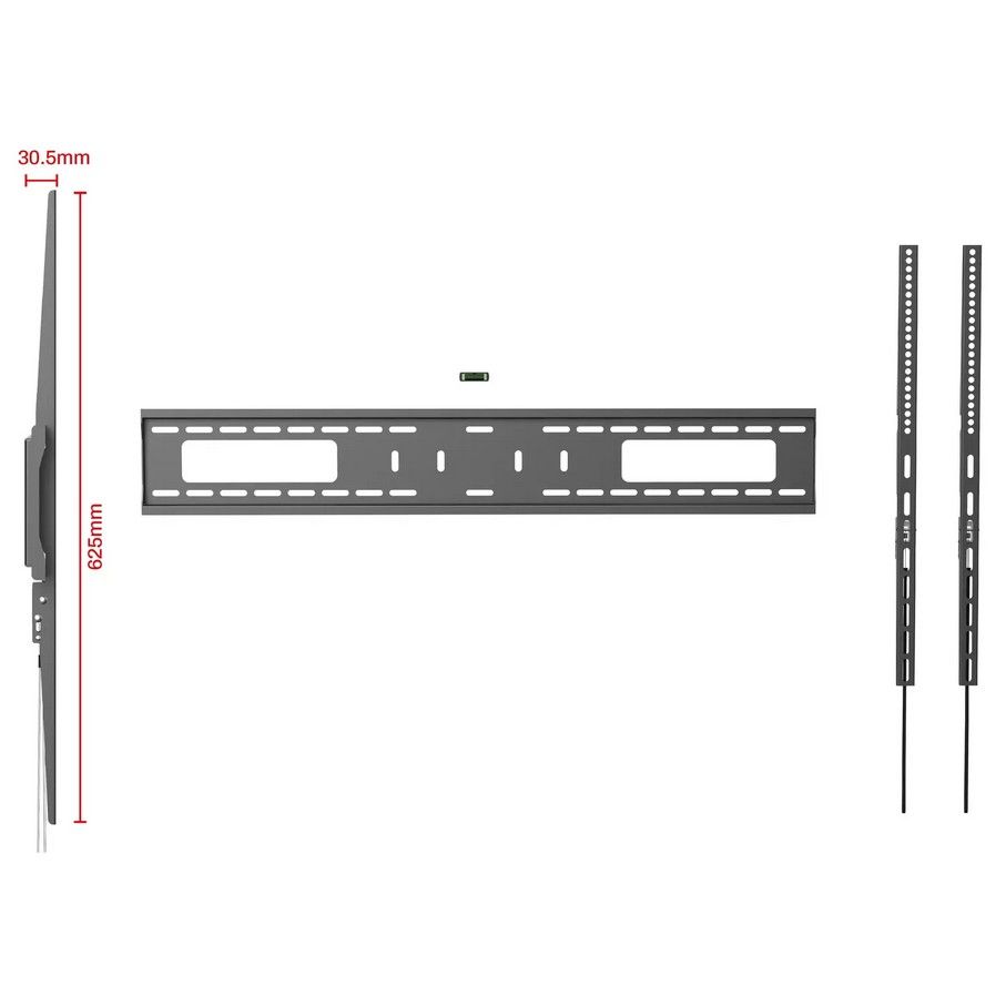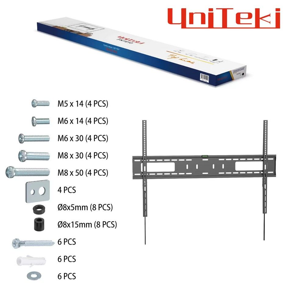 Кронштейн Uniteki FN1610, предназначен для телевизоров с размерами диагонали от 60 до 100 дюймов и весом не превышающих 75 кг. Крепление FN1610 позволяет повесить телевизор максимально близко к стене на расстояние 30 мм, входящий в комплект водный уровень обеспечивает точный монтаж кронштейна на стену.