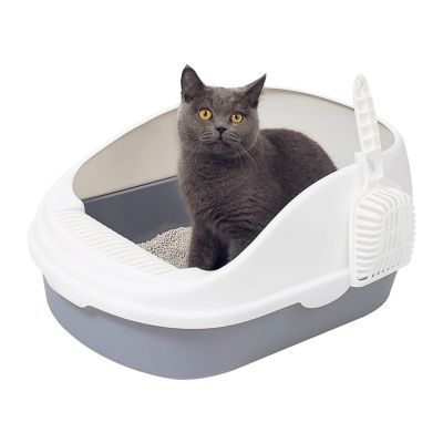 Туалет для кошки с высоким бортиком. Размеры: 55x38x25 см. Высокий бортик и удобный широкий выход предотвращают высыпание содержимого лотка. Бортик быстро и просто прикрепляется к лотку с помощью зажимов.