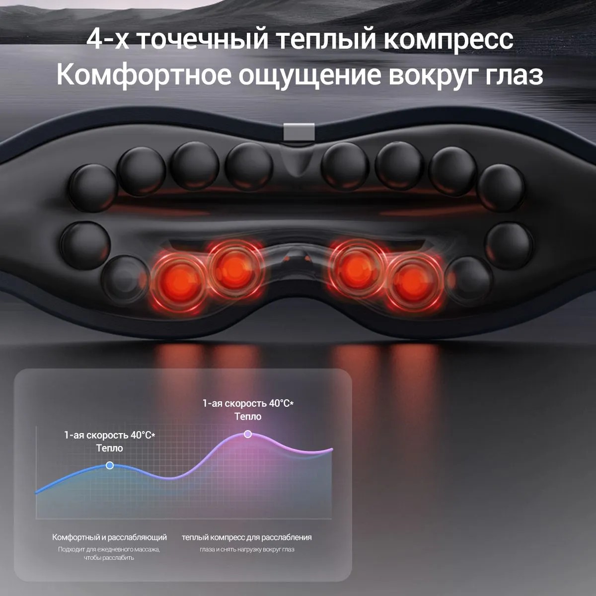 Четырехточечная система нагрева мягко окутывает область глазниц приятным теплом, усиливая эффект массажа. Теплый компресс способствует расширению сосудов, улучшает микроциркуляцию и помогает бороться с сухостью глаз. Сочетание вибрации и термотерапии создает спа-эффект в домашних условиях, позволяя полностью погрузиться в релаксацию и забыть о накопившейся усталости.