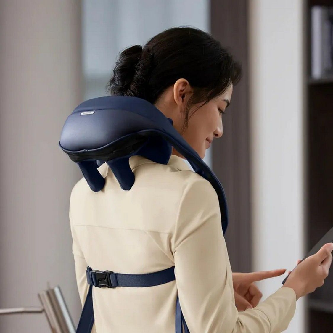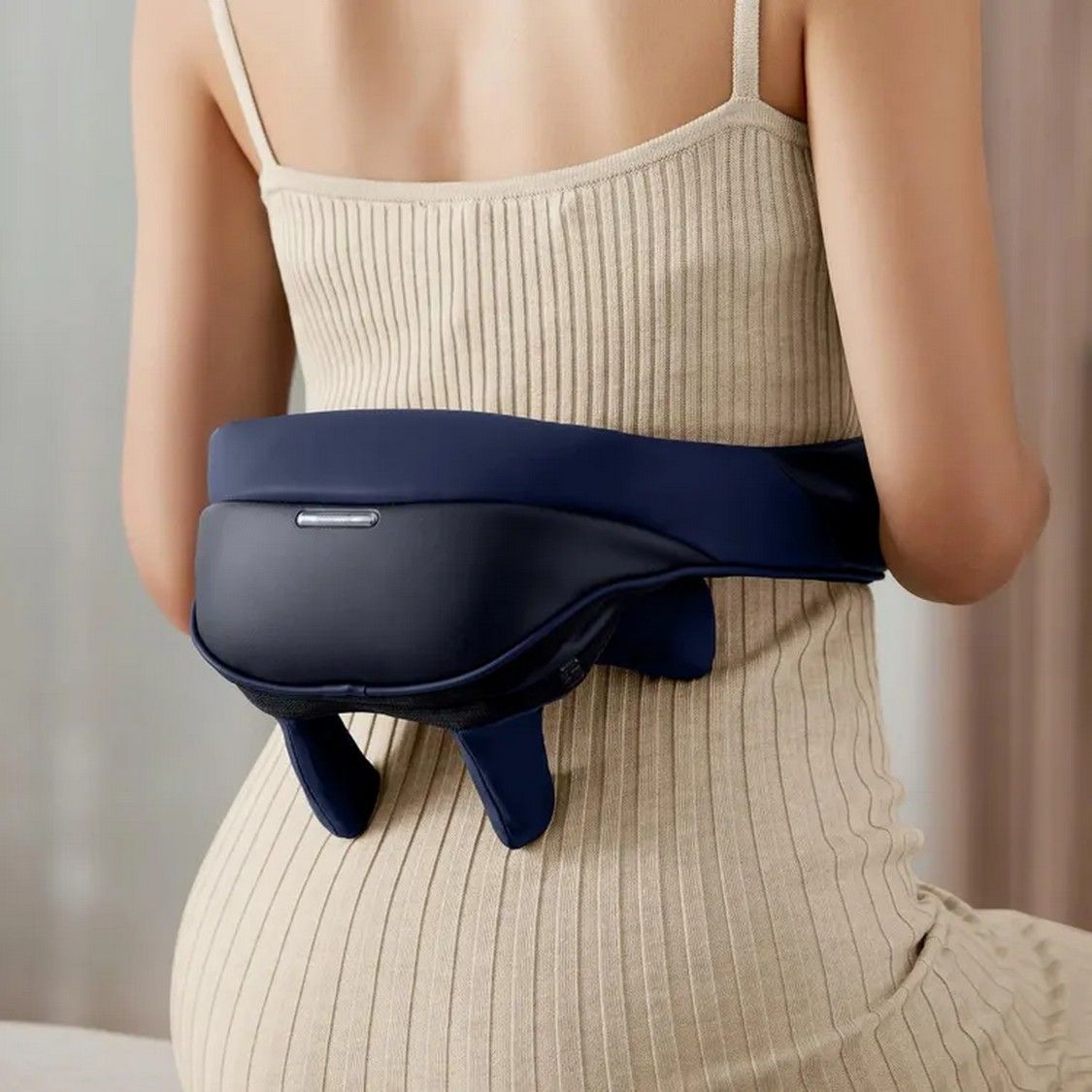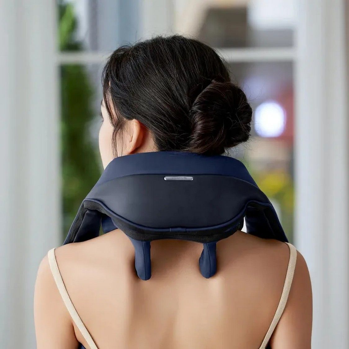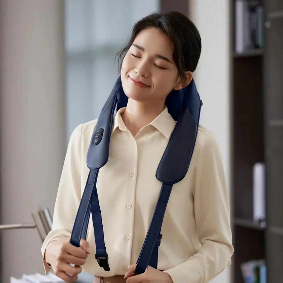 Корпус весит около 1,3 кг, что делает его легким и удобным в носке. Массажер слегка накрывает плечи и шею, не стесняя движений.