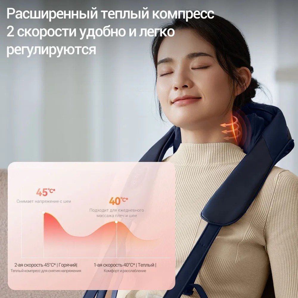 2 скорости удобно и легко регулируются. Мягкое тепло проникает в плечи и шею, сочетаясь с эффективным массажем, что позволяет быстро снять напряжение с шеи.