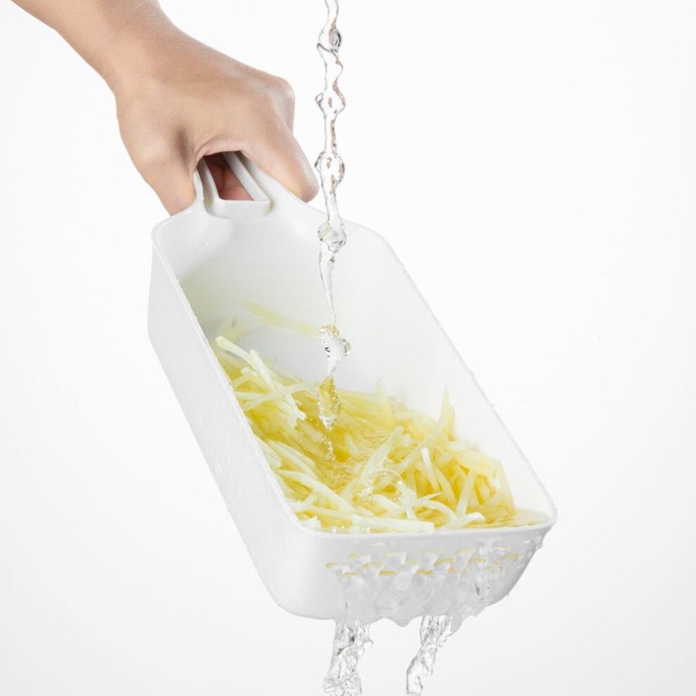 На верхней части контейнера предусмотрены дренажные отверстия, позволяющие сразу после нарезки промывать ингредиенты водой. Удобно и эффективно, продумано до мелочей для вашего комфорта.