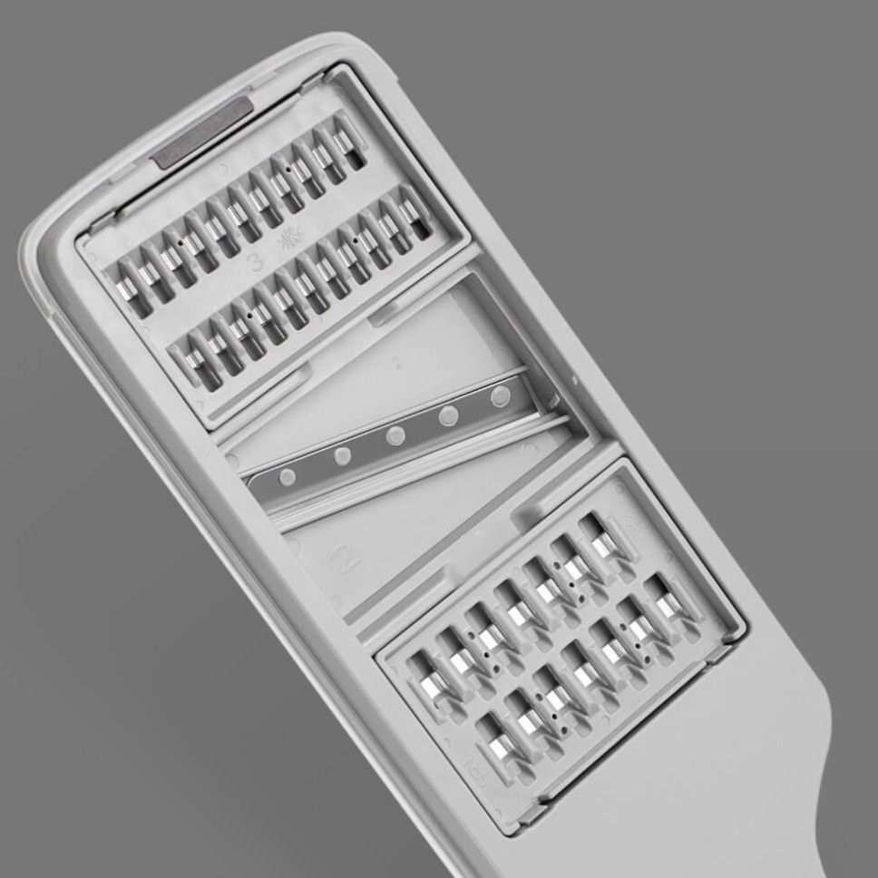 На обратной стороне тёрки предусмотрены специальные слоты для хранения лезвий. Это упрощает их замену и предотвращает потерю лезвий, сохраняя порядок и удобство.