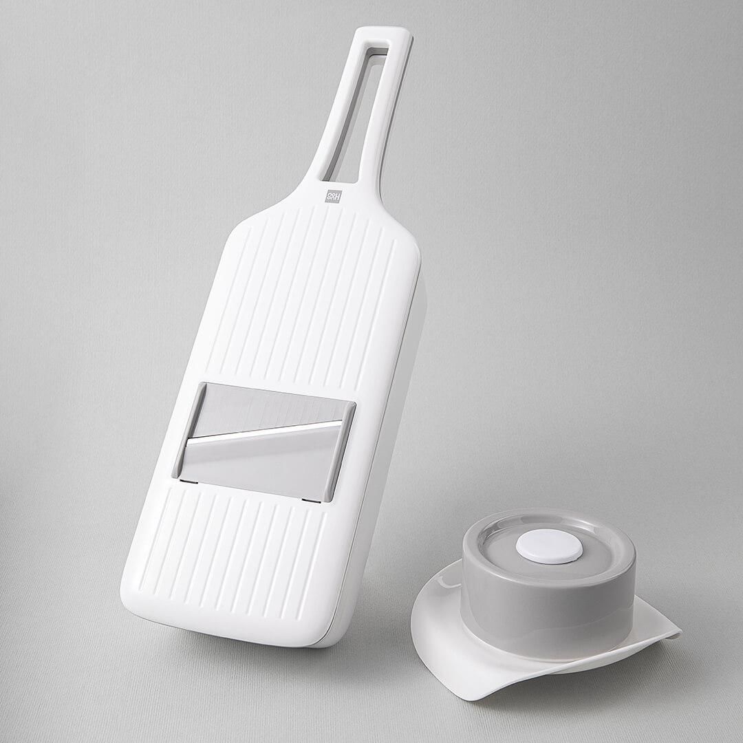 Тёрка оснащена безопасными направляющими, которые обеспечивают плавное движение защитного держателя. Закрытая конструкция направляющих на верхней части устройства предотвращает его выпадение и снижает риск травм.