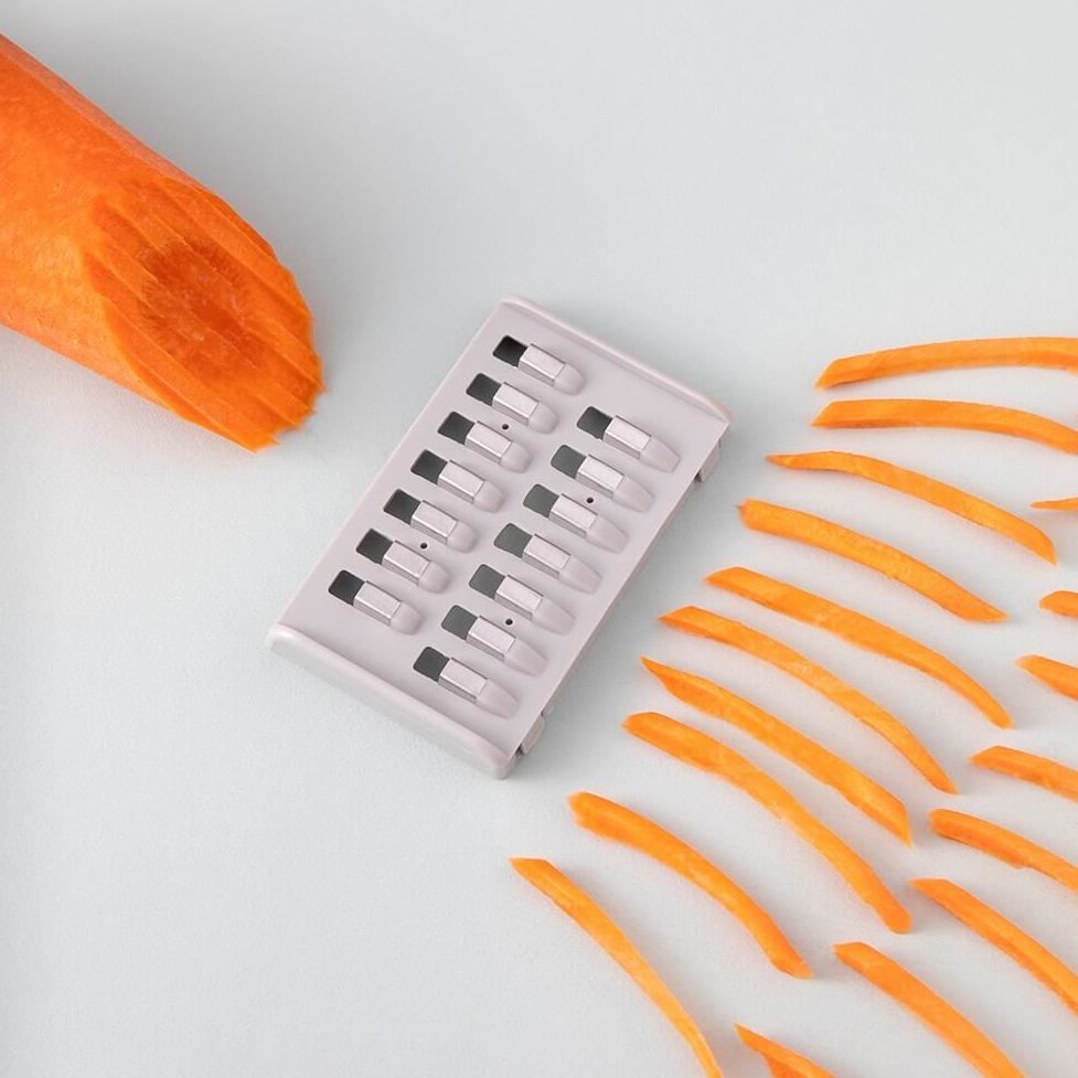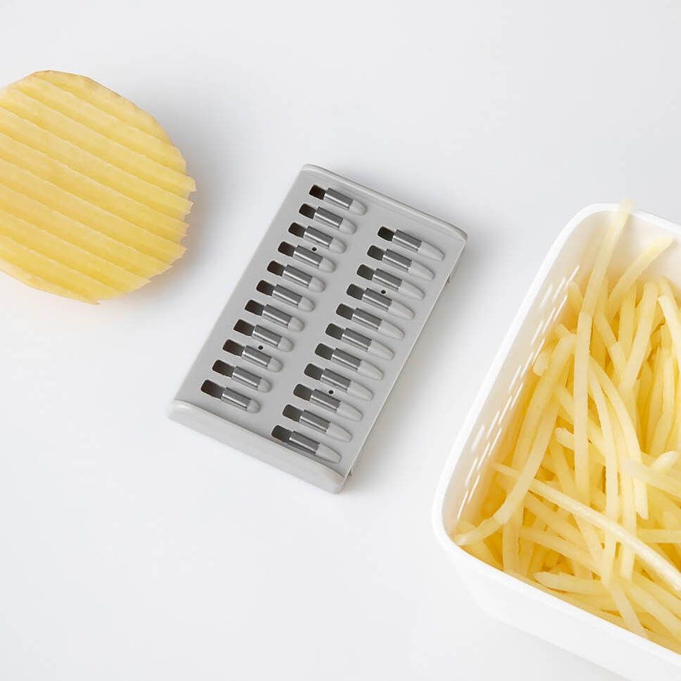 Оснащена тремя видами лезвий, позволяющими выбирать между нарезкой соломкой или ломтиками. Легко справляется с любыми продуктами, экономя время и силы — ваш незаменимый помощник на кухне.