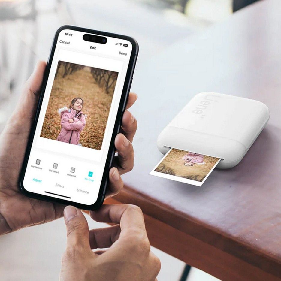 Liene Portable Photo Printer обеспечивает высокое качество печати фотографий с разрешением 300х300 пикселей и предлагает широкие возможности для их редактирования. В специальном мобильном приложении доступны фильтры, эффекты и рамки, а также выбор формата: с белыми полями, без рамок или в квадратном виде. Отправить изображение на печать можно сразу после сохранения на смартфоне, а процесс занимает менее минуты. Готовые фото размером 2х3 дюйма покрыты защитной блестящей пленкой, устойчивы к воде и сохраняют яркость и четкость до 10 лет. Принтер синхронизируется со смартфоном через Bluetooth 5.0 и совместим с системами iOS и Android.