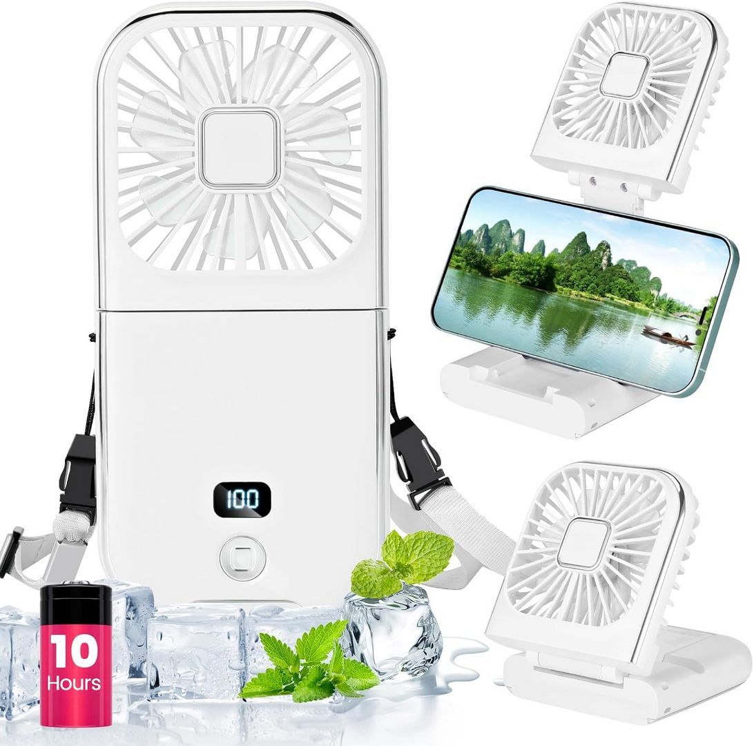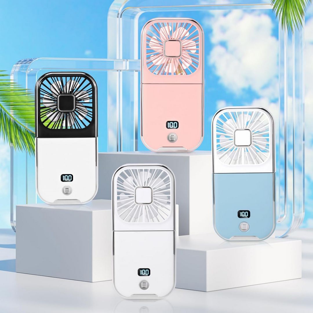 Этот мини-портативный вентилятор весит всего 130 граммов. Он может быть использован как вентилятор для шеи, ручной мини-вентилятор, мини-столик или подставка для телефона. Когда он сложен, он легко помещается в карман, сумку или рюкзак. Также его можно использовать как временную зарядную станцию для телефона, если это необходимо.