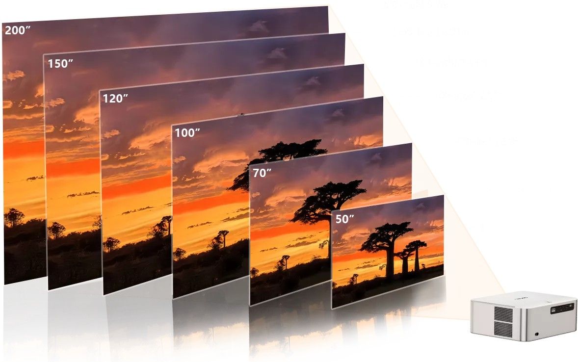 PV800 PRO проецирует изображение от 40 до 200 дюймов, создавая идеальный экран для любого помещения. Поддержка регулируемых соотношений сторон — 16:9 и 4:3 — делает его универсальным решением для просмотра фильмов, презентаций, игр и других задач, обеспечивая по-настоящему кинотеатральное впечатление у вас дома.