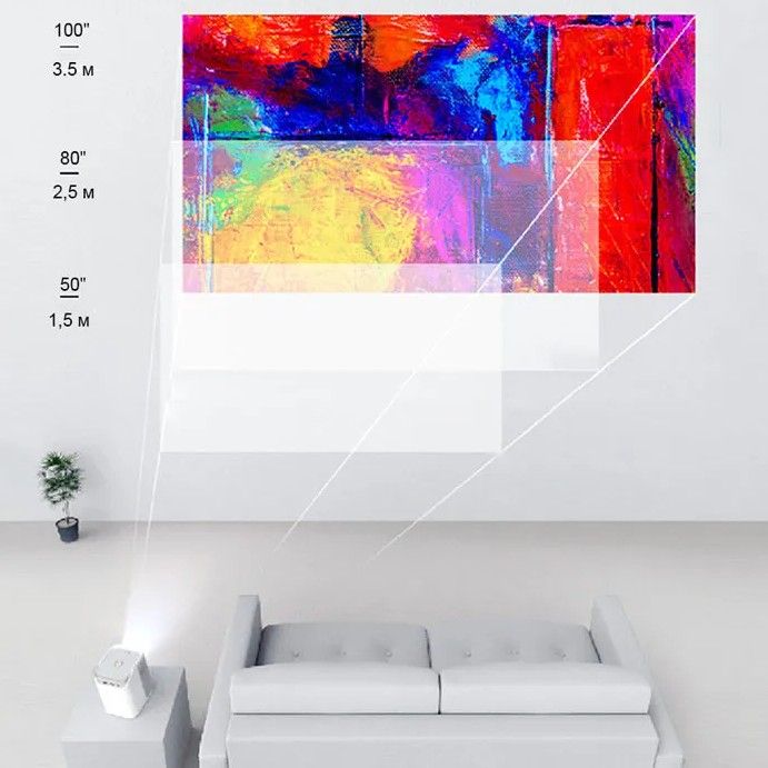 Минимальное расстояние до стены 1,5 метра, на этом расстояние ZEEMR D1 Pro выводит проекцию диагональю 50 дюймов. Максимальное расстояние 5 метров и проекция 200 дюймов.