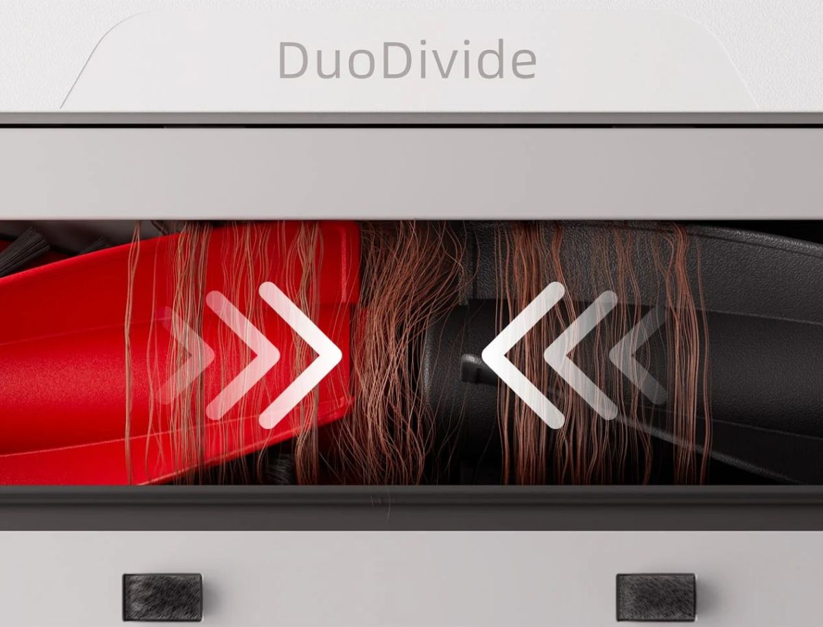 Щётка Duo Divide оснащена двумя параллельными роликами с короткой щетиной и спиралевидными лопастями, которые направляют волосы к центральному отверстию пылесборника, откуда мощный поток воздуха быстро удаляет их. Конструкция предотвращает спутывание и засорение, обеспечивая лёгкую очистку.