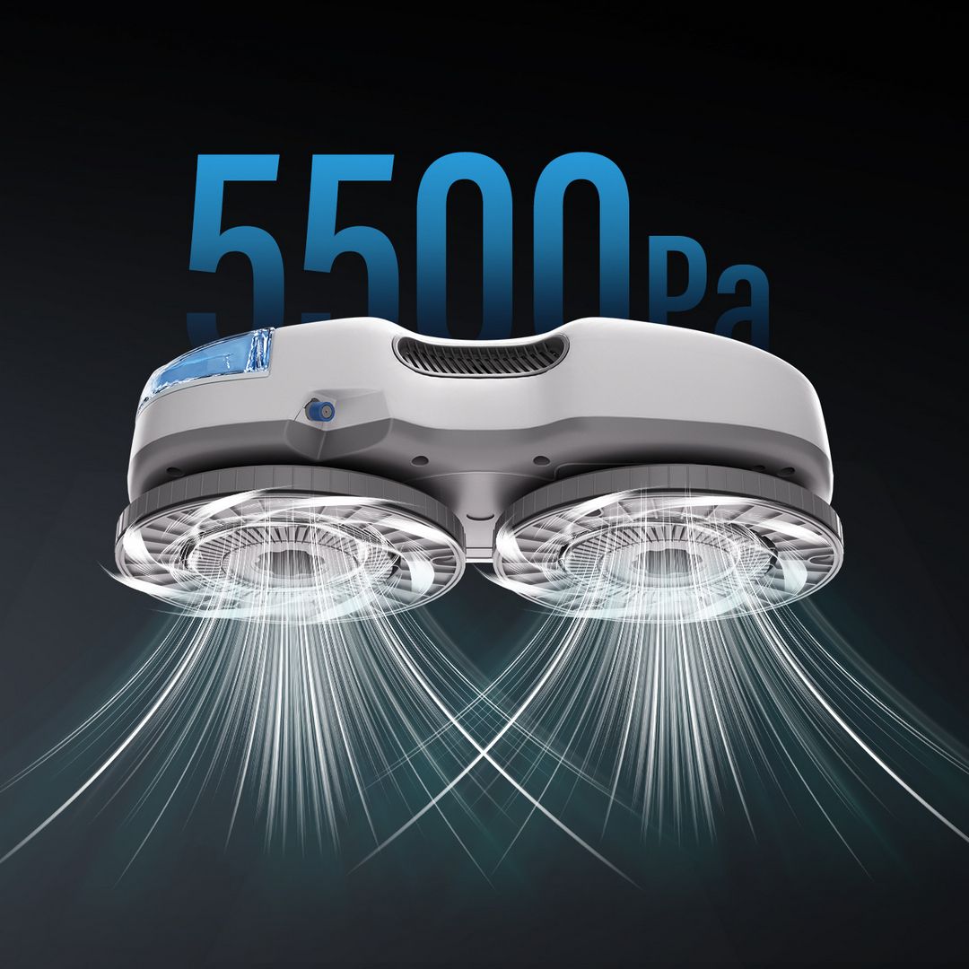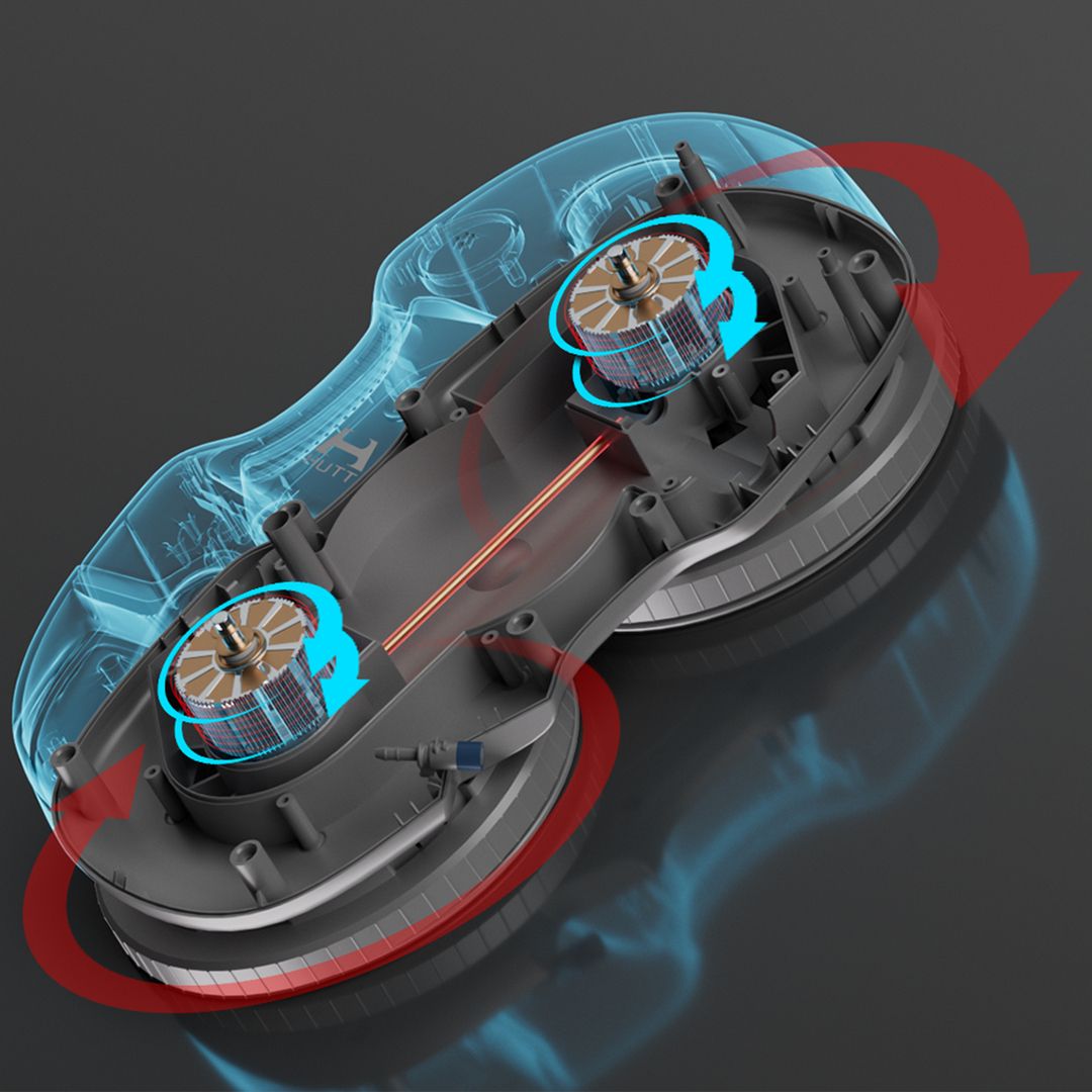 Вращающиеся бесщеточные DC-двигатели приводят в действие устройство. Пиковая сила всасывания достигает 5500 Па, что позволяет легко удалять пыль, водяные пятна, птичий помет и другие загрязнения.
