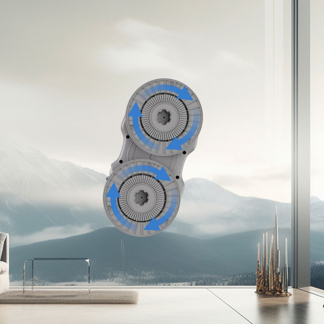 Два диска вращаются и протирают с высокой скоростью, которую трудно достичь человеческими руками, легко удаляя стойкие пятна, такие как птичий помет и известковый налет, при этом избегая повреждения стекла.