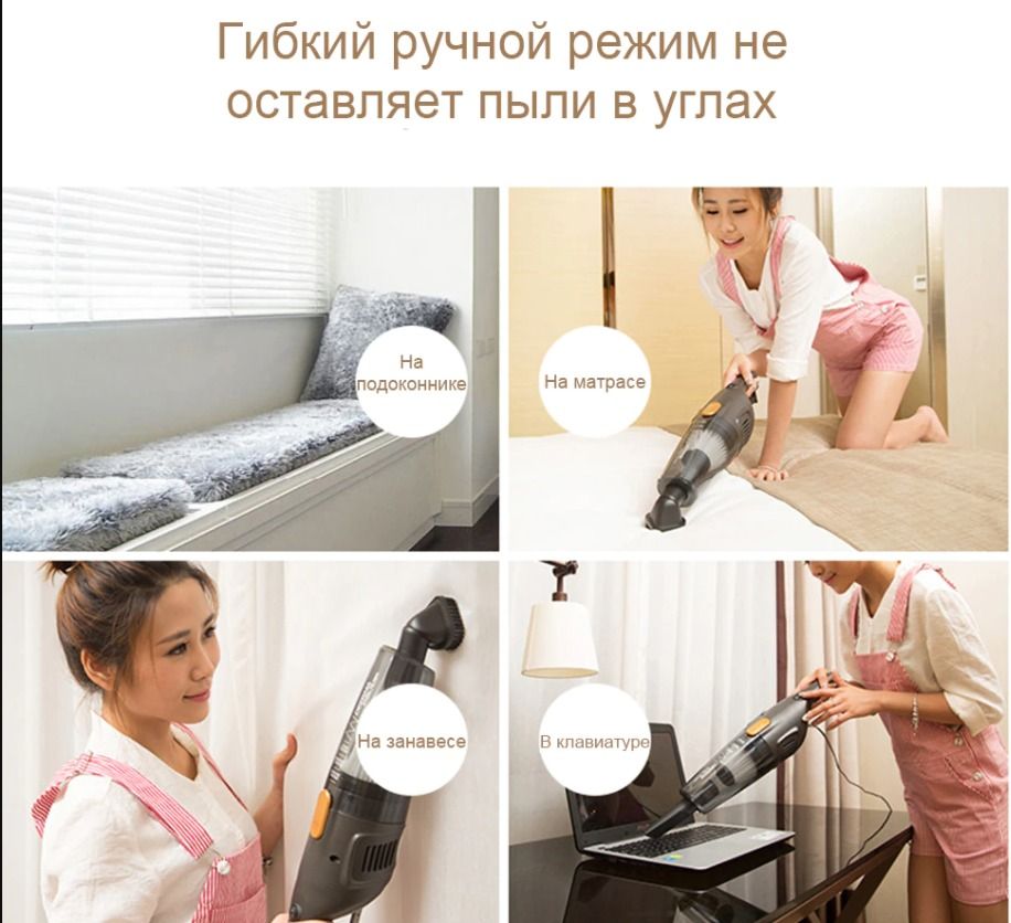 Благодаря мощному всасыванию 14 000 Па и разнообразию насадок - он способен очистить от пыли и мусора одежду, клавиатуру ноутбука, любые напольные покрытия, стены и другие поверхности в вашем доме.