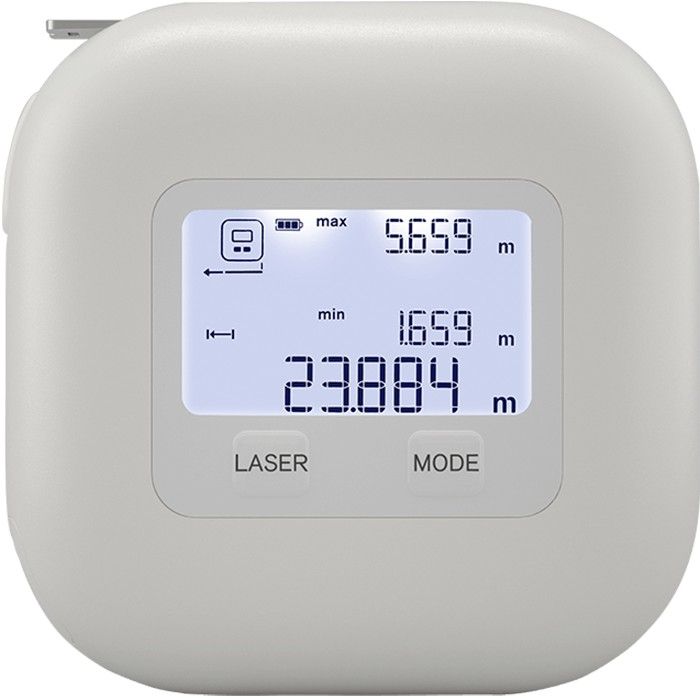 Измерительная рулетка позволяет замерять длину с помощью стандартной ленты (до 3 м) и современного лазерного дальномера (до 25 м). Устройство можно использовать в любом режиме для получения наиболее точного измерения.