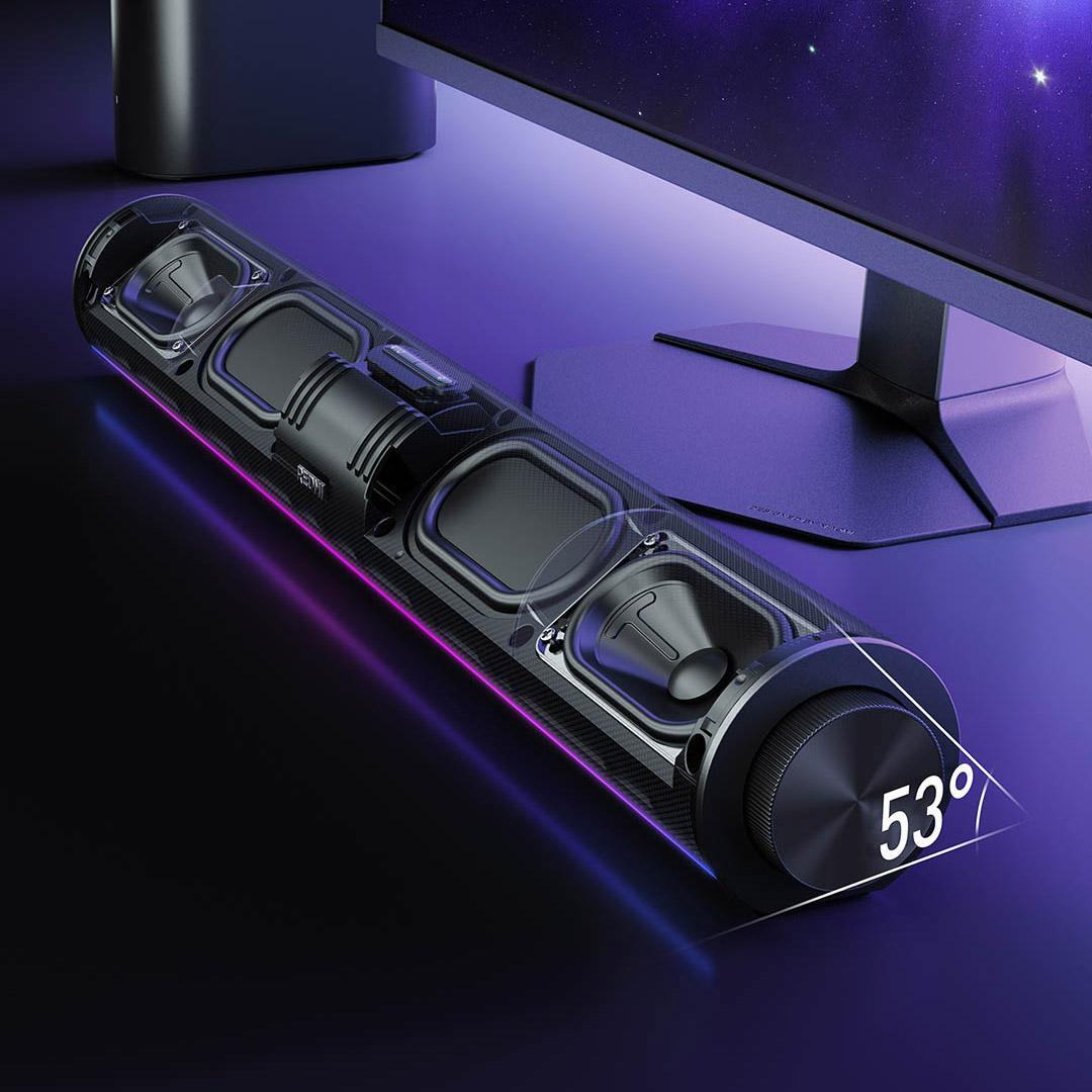 Акустическая система оснащена двумя крупными 10-ваттными широкополосными динамиками и двойными пассивными сабвуферами. Горизонтальное расположение четырёх акустических элементов создаёт широкую стереосцену прямо на рабочем столе. Независимый блок питания обеспечивает стабильную подачу энергии, позволяя воспроизводить детализированный звук с чётким разделением высоких и низких частот.