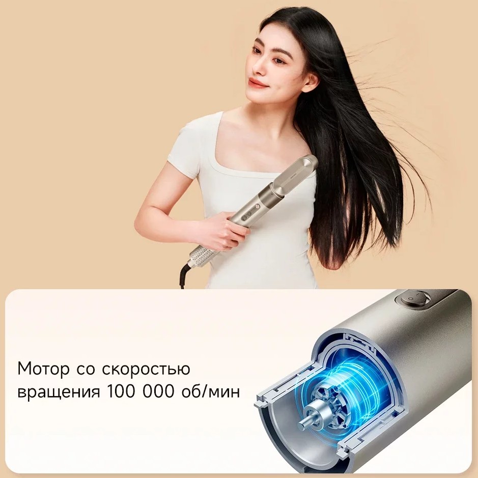 Мощный поток воздуха, обеспечиваемый мотором со скоростью вращения 100 000 оборотов в минуту, эффективно удаляет влагу с волос, экономя время и обеспечивая комфорт.