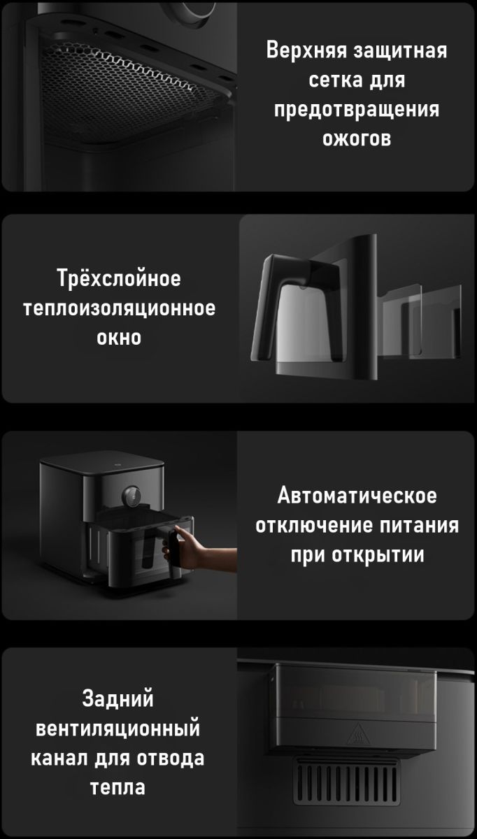 - Комплектация: Mijia Smart Air Fryer 6.5L, Корзина для жарки, Решетка для запекания, Инструкция по эксплуатации