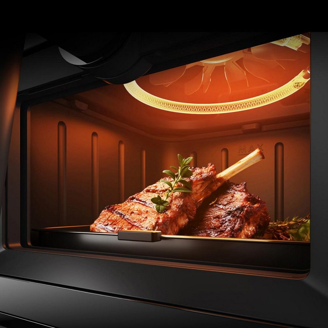 Режим запекания с водяным паром и интеллектуальной технологией распыления создает 3D-водяную дымку, образующую защитную пленку на поверхности ингредиентов. Это позволяет быстро сохранять натуральные соки, увеличивая уровень удержания влаги на 23%, делая блюда нежными и сочными.