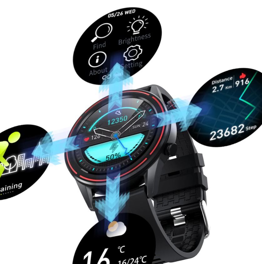 Kumi GT3 black - первые смарт-часы с технологией Magic DIY Smart. Круглый сенсорный экран (1,28-дюймовый жидкокристаллический дисплей) защищен от попадания частичек пыли и влаги, оснащен линзами из закаленного стекла (7Н).