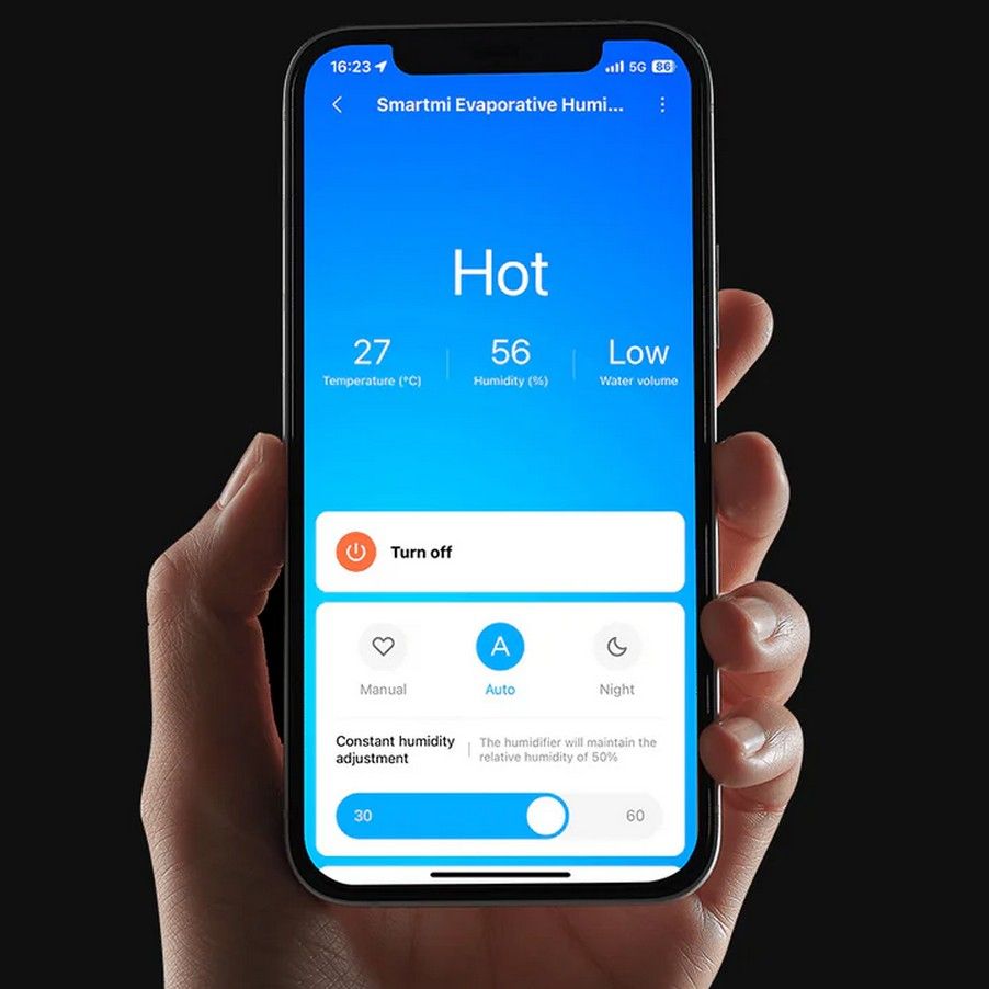 Устройство автоматически определяет и настраивается в режиме постоянной влажности, поддерживая относительную влажность на уровне 55%. Установите желаемый уровень влажности через приложение Mi Home, чтобы создать свое персонализированное комфортное пространство.