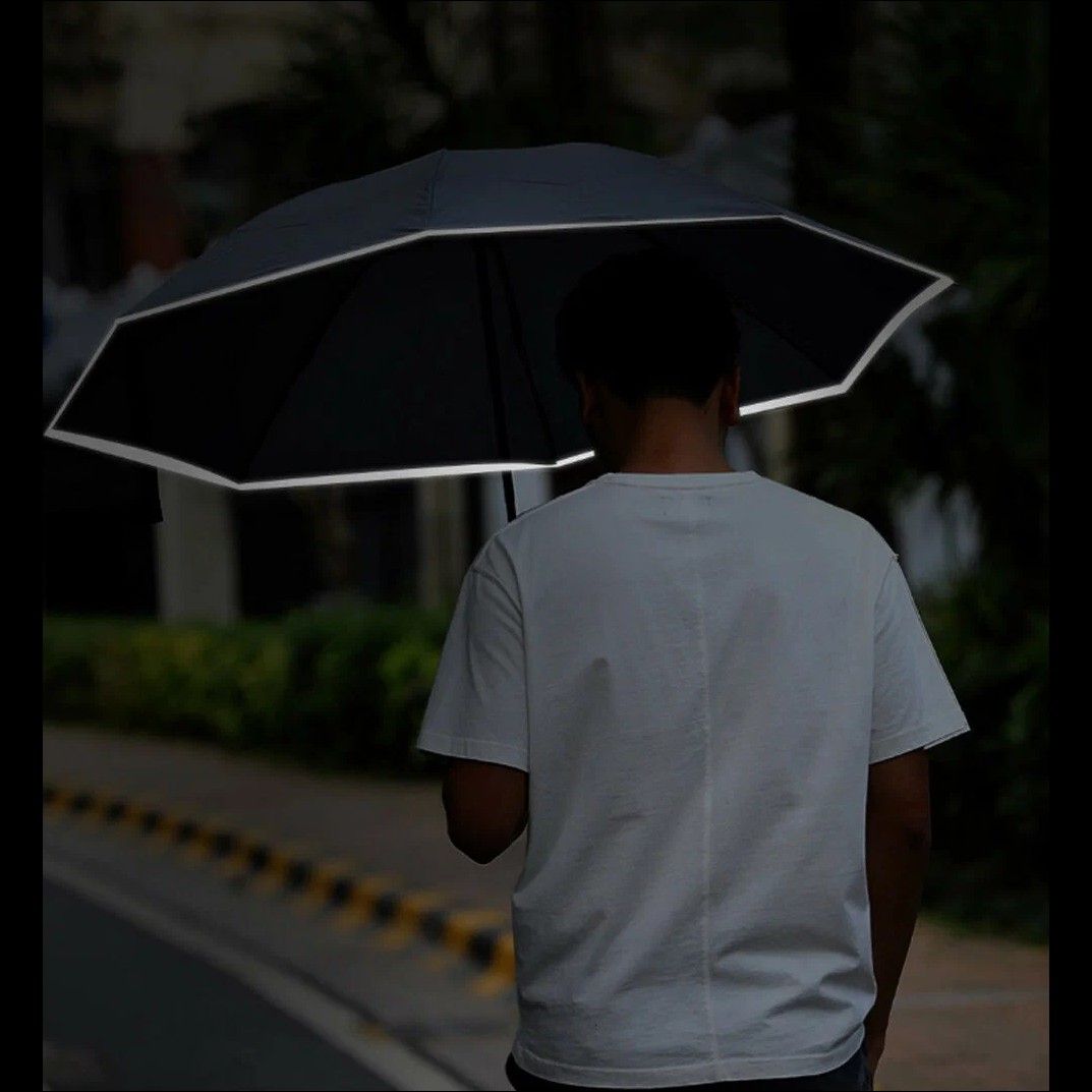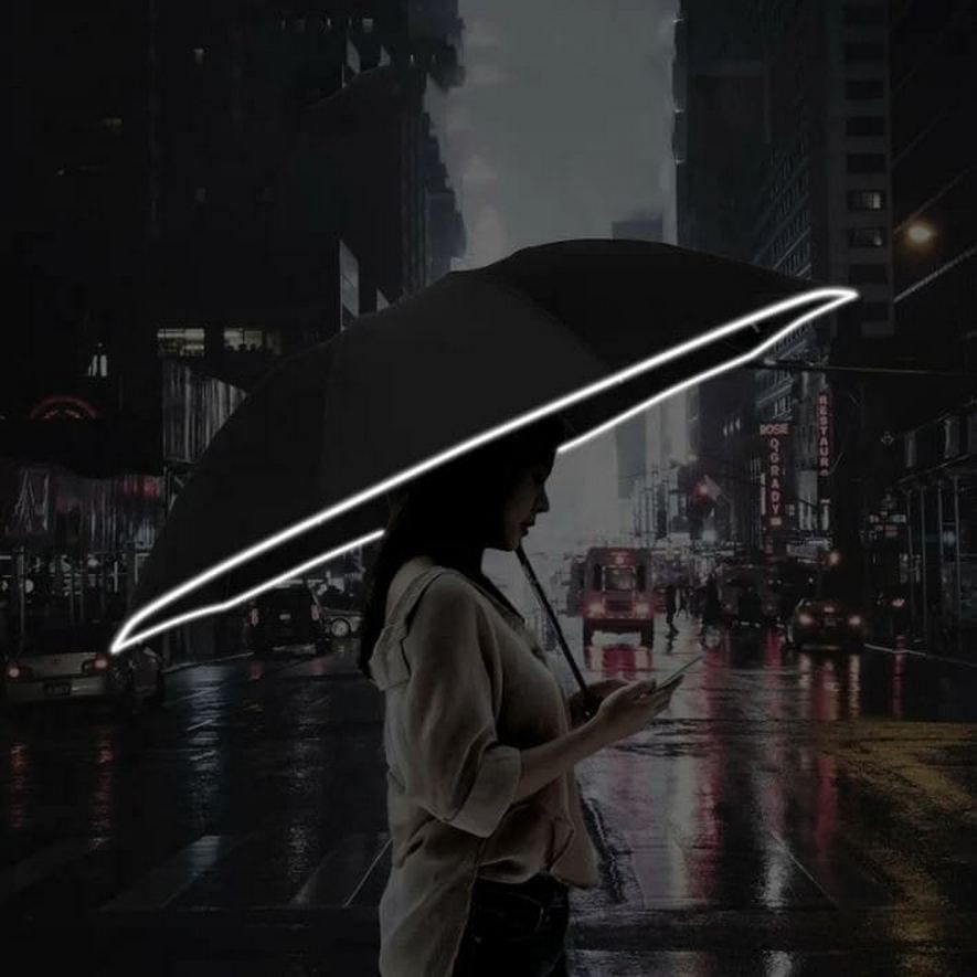 Зонт с фонариком Xiaomi KongGu Reverse Ten Bone Automatic Lighting Umbrella – классический вариант автоматического зонта с обратной (реверсивной) системой сложения. Версия с обратным сложением, скрывает мокрый купол внутрь, что подходит для автомобиля или общественного транспорта.